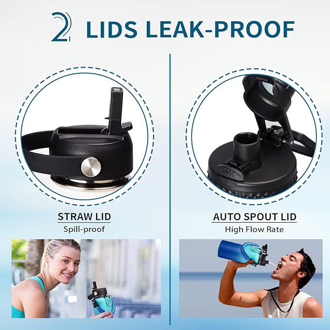 - LEAK-PROOF 2 LIDS - AUTO SPOUT LID & STRAW LID allow you enjoy spill-proof sipping and fast drinking to meet your different drinking needs. The pop-up spout lid is designed for one-hand open and close, with a large water outlet for fast drinking. The spill-proof straw lid makes you easy sip on the go, great to all your outdoor adventures, and also prevent the inhalation of ice cubes