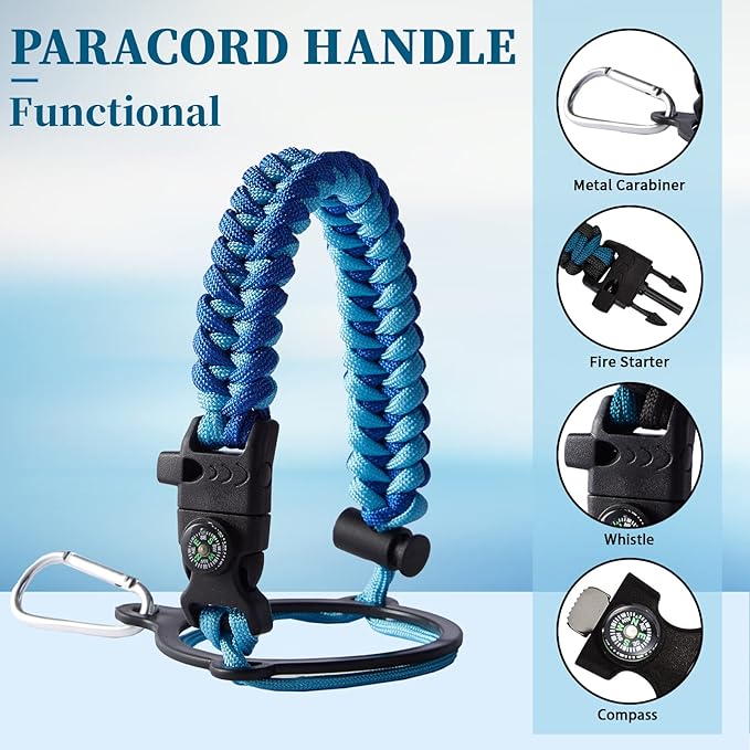 - PERSONALIZATION BOTTLE PARACORD HANDLE - Quarter gallon water bottle with a pretty cool functional paracord handle which does more than meets the eye.?The survival strap cord is made of military-grade nylon and comes with a compass, safety loop, metal carabiner, flint, igniter, and whistle, making it a functional and stylish addition to your thermo water flask, is perfect for outdoor camping, hiking, fitness enthusiasts