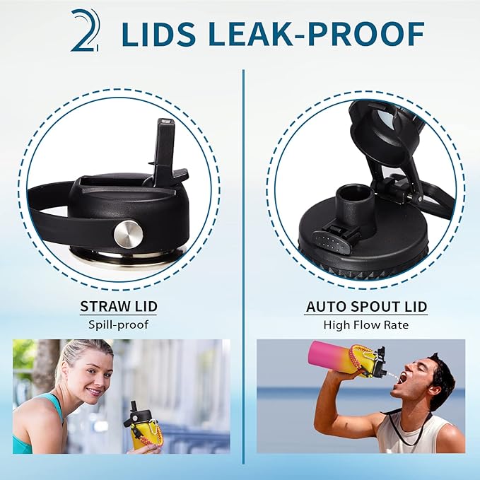 - LEAK-PROOF 2 LIDS - AUTO SPOUT LID & STRAW LID meet you different drinking need, and both lids are leak proof and with handle for carrying on the go. The pop-up spout lid features a button for one hand open quickly, and a large water outlet for fast drinking. The straw lid with straw lets you enjoy spill-proof sipping to all your outdoor adventures, also can prevent the inhalation of ice cubes