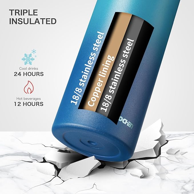 - TRIPLE INSULATION: Stainless steel water bottles with Triple-insulation technology,2 stainless steel walls enclosing an inner copper, this keeps the insulated water bottle 32 oz Cold up to 24+ hours and Hot up to 12 hours, which also can reduce the condensation effectively. Insulated water bottles ensures you have a cool drink after exercise in summer or enjoy warm coffee outdoor in winter.