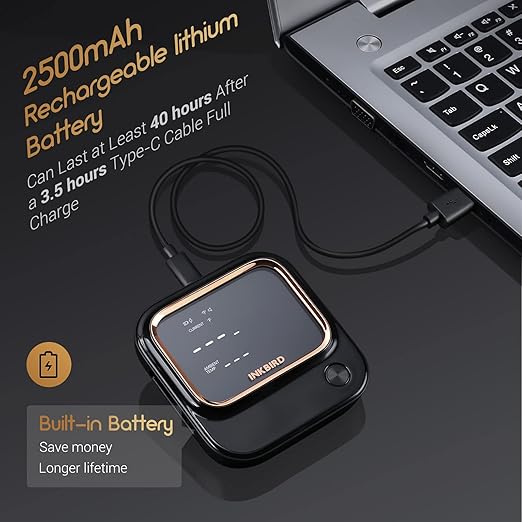 - 【Different Level Deluxe Design & Readable Backlit LCD Screen & Rechargeable 2500mAh lithium Battery】The bbq thermometer with luxury and outstanding design. The screen brightness can be adjusted via the app, the temp data are clear even under the sun. The large LCD screen displays the meat probe readings, ambient/oven temp, the setting temp, high/low temp alarms simultaneously. The built-in battery oven meat thermometer will last at least 40 hours after a 3.5 hours type-C cable full charge.
