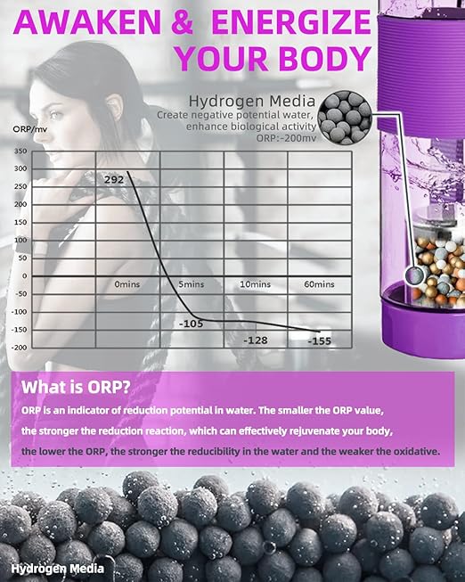 - Reduce ORP levels: Water purifer bottle contains natural alkaline stone sintered at a low temperature of 800 ℃, which effectively reduces OPR in water to -150mv. This helps keep your body active and alleviate anxiety about aging.