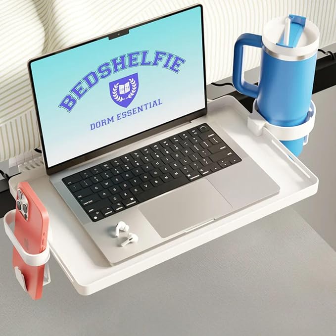 BedShelfie Bedside Shelf for Dorm Room Bunk Bed & Top Bunk, College Dorm Room Essentials, Bedside Caddy, Clip on Floating Tray, Bed Side Table Storage, Loft Nightstand Decor - Dorm Essential, White