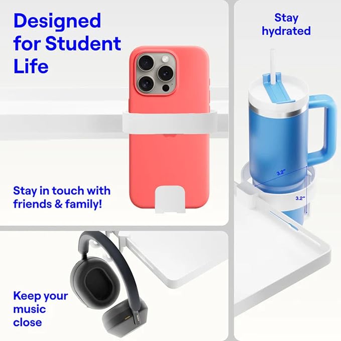 - ENDLESS CUSTOMIZATION WITH MODULAR ACCESSORIES: Take your bedside setup to the next level with the DormEssential's clever Hole & Peg system, built for compact living. This all-in-one model includes a cup holder (fits up to a 40oz Stanley tumbler), phone holder, and two j-hooks for hanging gear. Each accessory snaps in effortlessly, so you can arrange your space exactly how you like it. Designed for dorm rooms, loft beds, and small-space living—perfect for college students who want function without sacrificing style.