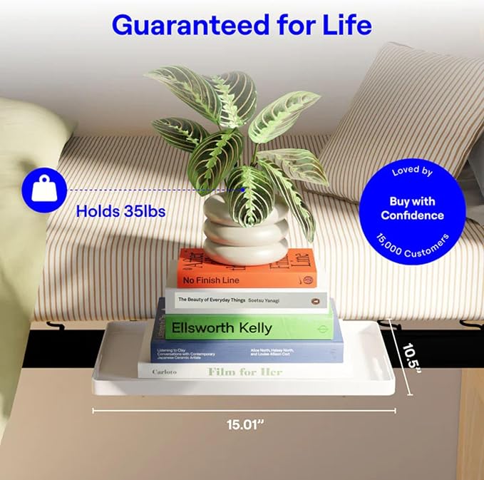 - SLEEK & FUNCTIONAL DESIGN: The BedShelfie Bed Shelf Table combines modern style with everyday practicality, making it a smart addition to any space. Featured in Apartment Therapy, BuzzFeed, and Real Simple, this floating nightstand is ideal for small rooms and tight setups. Its clean, minimalist design fits seamlessly with any décor while offering flexible storage—use it as a nightstand, mini desk, or bookshelf. Perfect for dorms, college students, and anyone looking to maximize function without sacrificing style.