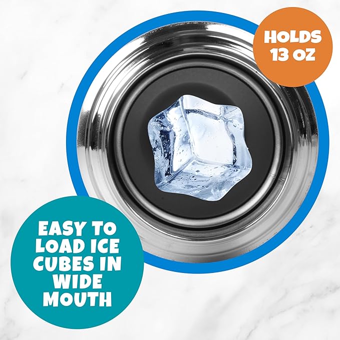 - HOLDS 13 OZ: This waterbottle holds 13 ounces of liquid, with a mouth wide enough for most ice cubes. Measuring about 8 in x 3 in, it fits on the side of most backpack pockets, making it great for Back to School, Day Care, Sports Practice, Summer Camp and more!