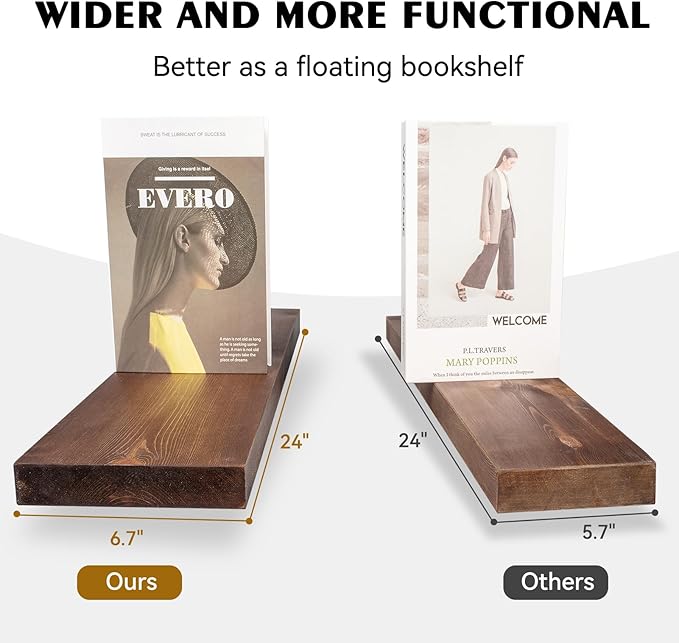 - Solid Wooden Floating Shelves – Crafted from real pine, each 24-inch floating shelf is finished with a rich walnut stain, showcasing the natural wood grain and subtle knots for a warm rustic charm that blends seamlessly into any home décor