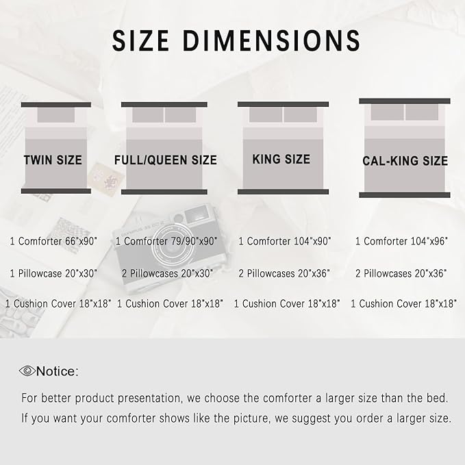 - King Size : 4 Pcs King Comforter Set includes one comforter measures 104x90 inches, two pillow cases measure 20x36 inches, and one decorative pillowcase measures 18x18 inches