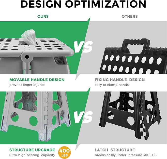 - 【Lightweight & Portable】Easy to carry around, this foldable step stool can be used across rooms or taken outdoors. Its compact design fits into any storage space, even your car for those camping trips. Upgrade your portability with Solid Strength.