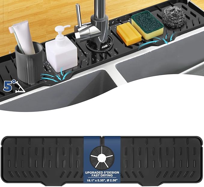 - đȘă5° UPGRADE VERSIONă Silicone sink faucet mat with upgraded 5° slope design and upgraded 0.79" (2 cm) thickness, the kitchen faucet splash guard allows captured water to flow into the sink faster, resulting in faster drying of the kitchen sink. This means never gets soggy, or not having any water spots by the sink faucet. You don't need to worry about the water staying on the sink & bathroom counter. Upgrading your kitchen sink & bathroom countertop in an effort-saving way!