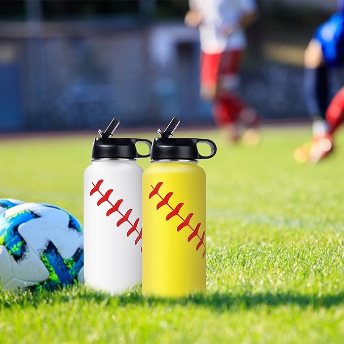 40oz Wide Mouth Softball Water Bottle with Two Lids(Straw, Handle Lid), 18/8 Stainless Steel Vacuum Insulated for Travel & Sport Cup. (Softball Yellow, 40oz)