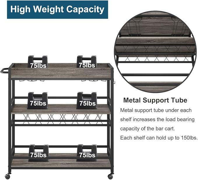 - Enhanced Stability and Convenience: To enhance this liquor cart’s weight capacity and durability, we have added two metal support rods under each shelf. Each shelf can easily hold up to 150 lbs. Additionally, the cart features 3 hanging hooks on the side, providing a convenient way to hang your towel, bar accessories, and more.
