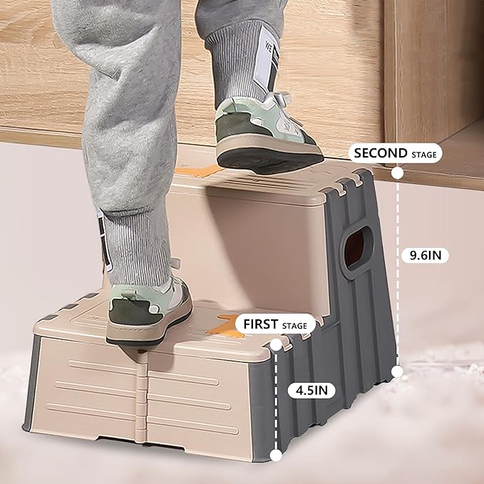 - 【Step Stool for Kids & Adult】The first step of the step tool is 4.5 inches high and the second step is 9.6 inches high, which is in line with the kid's body and makes it easier for your kid to get up and down. With the high quality material and scientific structural design, The stepping stool has a maximum weight capacity of 200 lbs, making it suitable for both children and adults.