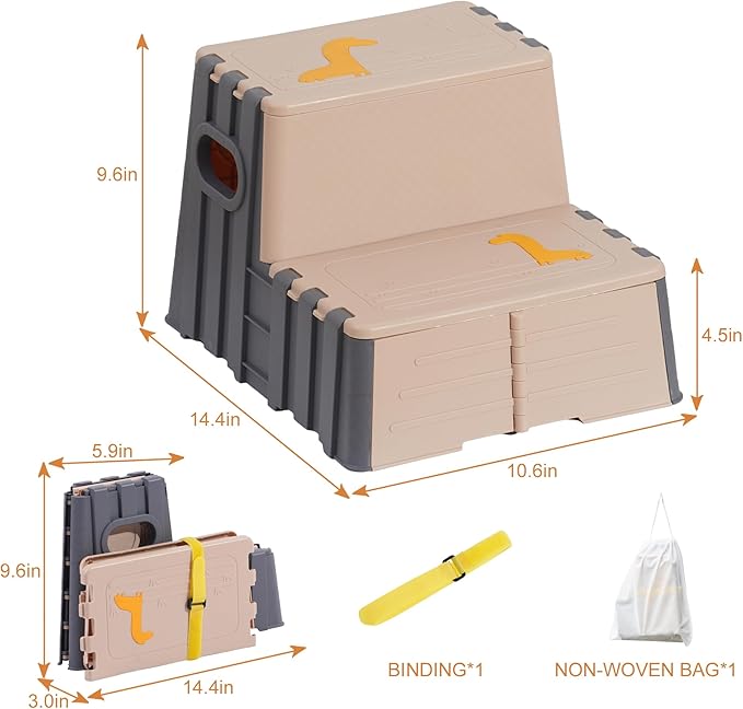 - 【Foldable Design】This foldable toddler step stool is light and easy to carry with folded size:14.4*3.0*9.6in, does not take up space when you take the step stool out for gardening, camping, boating or under the sofa or bed lying down or vertically between a wall and appliance or furniture when not in use.