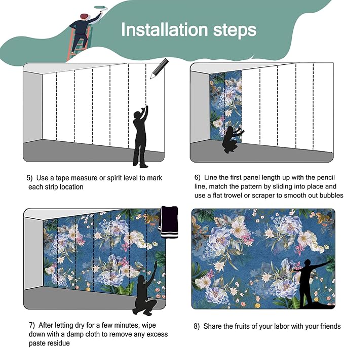 - Mural wallpaper size: 140 "W x 102 "H, divided into 7 sections, each section is labeled with a number underneath, there is no need to overlap the pattern when installing, just install according to the number labeled underneath the panel