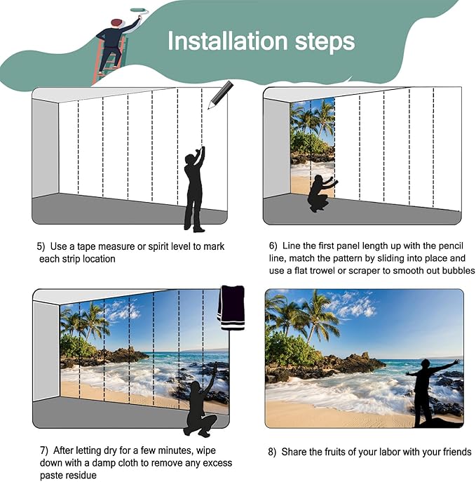 - Mural wallpaper size: 160 "W x 112 "H, divided into 8 sections, each section is labeled with a number underneath, there is no need to overlap the pattern when installing, just install according to the number labeled underneath the panel