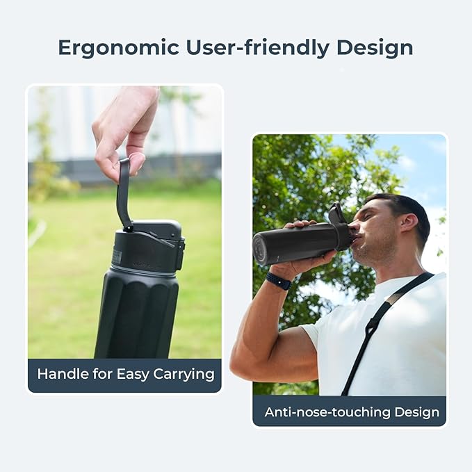 - 𝑺𝒎𝒂𝒓𝒕 𝑹𝒆𝒎𝒊𝒏𝒅𝒆𝒓𝒔 & 𝑳𝑬𝑫 𝑫𝒊𝒔𝒑𝒍𝒂𝒚: Never forget to drink water with dual reminders! The WaterH app sends notifications to your phone or smartwatch, while the lid's light ring illuminates at set times. The smart bottle greets you with "Hello" each time you open it and provides instant progress updates on a clear digital display.