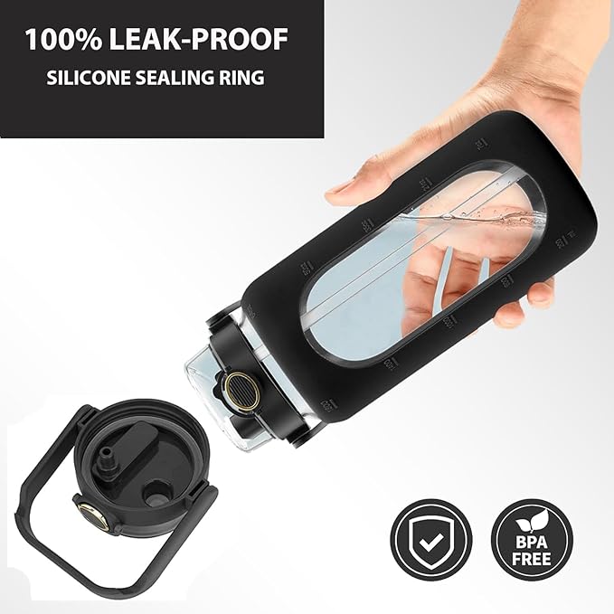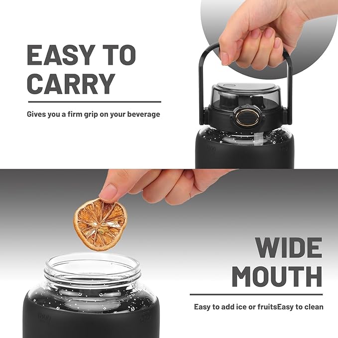 - Motivational Time Marker: This large 64 ounce glass water bottle with time markers helps you stay hydrated throughout the day by encouraging you to drink 8 cups of water, helping you maintain a healthy lifestyle. The easy-to-read markings in 16 oz increments also let you know how much water you’ve consumed throughout the day, helping you track your daily water intake
