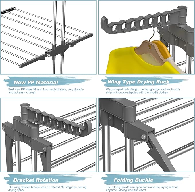 - 🧦HIGH-QUALITY MATERIAL👔 The drying clothes rack is made from high-quality stainless steel and thickened plastic, with strengthened support rods on both sides, strong load bearing capacity and stability. High-quality material makes it strong enough to stand up to 55 lbs.