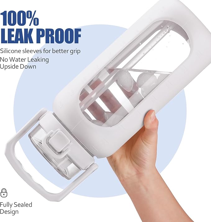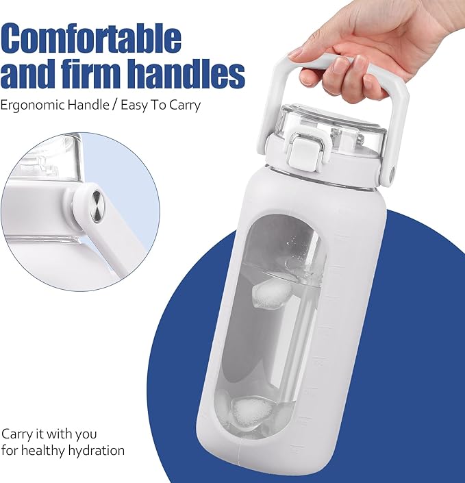 BLUEGO 64 oz Glass Water Bottle, Drinking Water Bottle with Handle and Straw, Half Gallon Motivational Water Bottle with Silicone Sleeve and Time Marker, Sports Water Bottle, BPA Free White