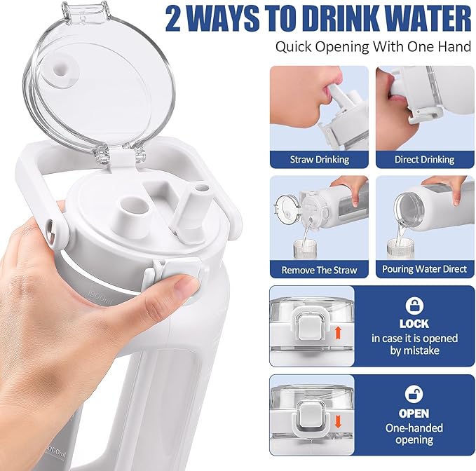 - EASY TO CARRY: BLUEGO 64oz Water Bottle comes with a portable carrying handle with a wave design on the handle to provide more grip, also with a non-slip silicone sleeve to provide protection against hand slippage, easy to hold and carry,sturdy and durable. Meanwhile the bottle comes with a sealing cap that effectively prevents water leakage. The handle on the cap can be easily opened and closed, convenient for you to drink at any time.