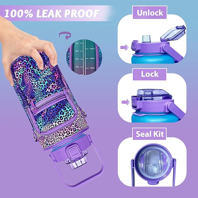 64 oz Water Bottle with Straw Sleeve & Strap Motivational Half Gallon Water Jug with Handle for Gym Women Men Aesthetic Water Bottle with Strap Leopard