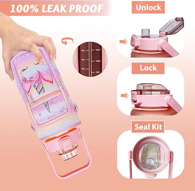 64 oz Water Bottle with Straw Sleeve & Strap Motivational Half Gallon Water Jug with Handle for Gym Women Men Aesthetic Water Bottle with Strap Unicorn