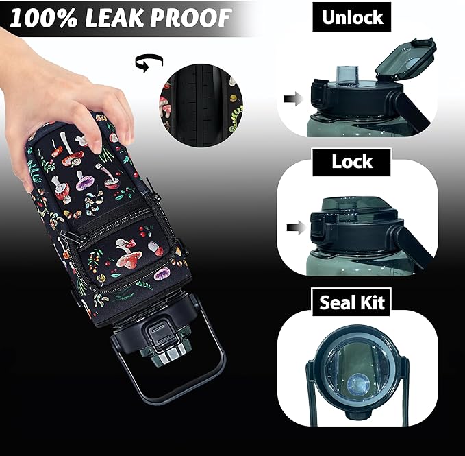 64 oz Water Bottle with Straw Sleeve & Strap Motivational Half Gallon Water Jug with Handle for Gym Women Men Aesthetic Water Bottle with Strap Black Mushroom