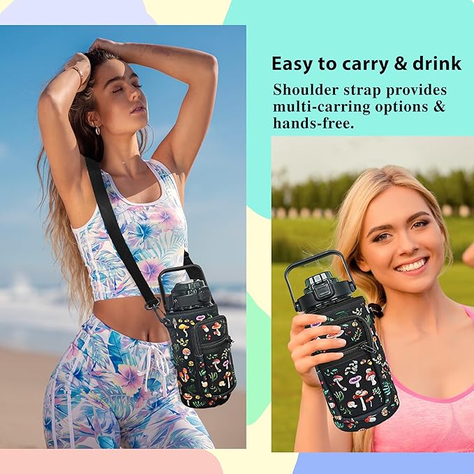 - [High Quality Storage Sleeve]: Our water bottle holder with a durable neoprene storage pouch makes it easy to store your belongings. The padded shoulder strap can be removed or adjusted to provide different carrying options. The sleeve not only protects your water bottle from impacts but can also maintain the temperature and prevent condensation from dripping on floors or seats. Please note that the bottle itself is not insulated.
