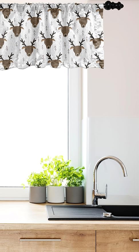 Ambesonne Landscape Window Valance, Winter Woods Theme Pattern of Deer Heads with Antlers and Fir Trees, Curtain Valance for Kitchen Bedroom Decor with Rod Pocket, 42" x 12", White Sepia Dark Taupe