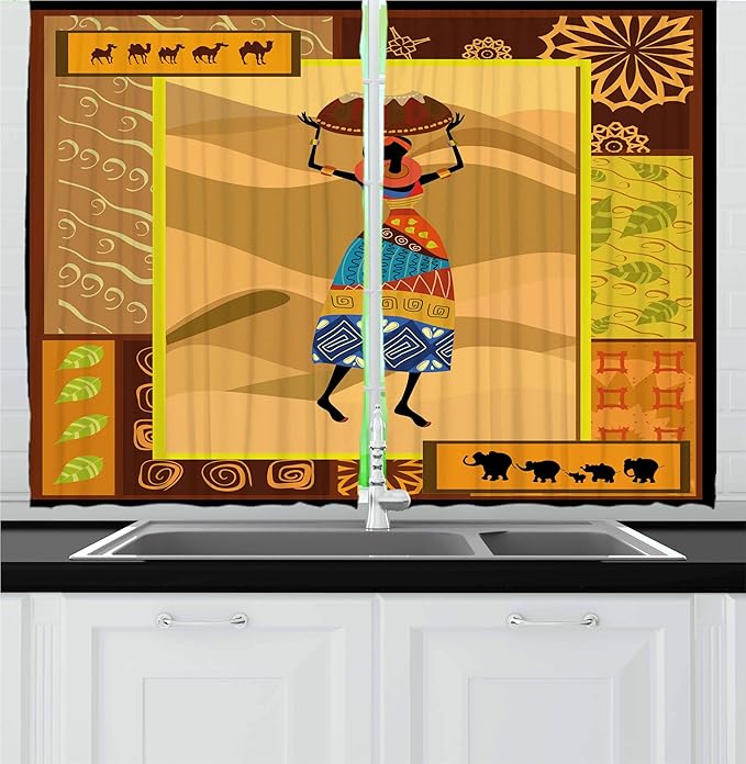 Ambesonne African Kitchen Curtains, Ornate Nature Inspired Motifs Swirls Camels Lady with Jug Print, Window Drapes 2 Panel Set for Kitchen Cafe Decor, 55" x 24", Beige Brown