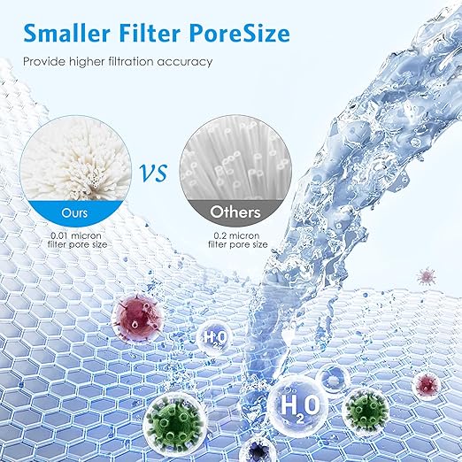 - 【Smaller pore size 】Hollow fiber ultrafiltration membrane has a pore size of 0.01 micron, which can filter out 99.99% of the harmful substances in water, while the pore size of other brands is only 0.2 micron. The smaller the pore size, the higher the filtration precision.