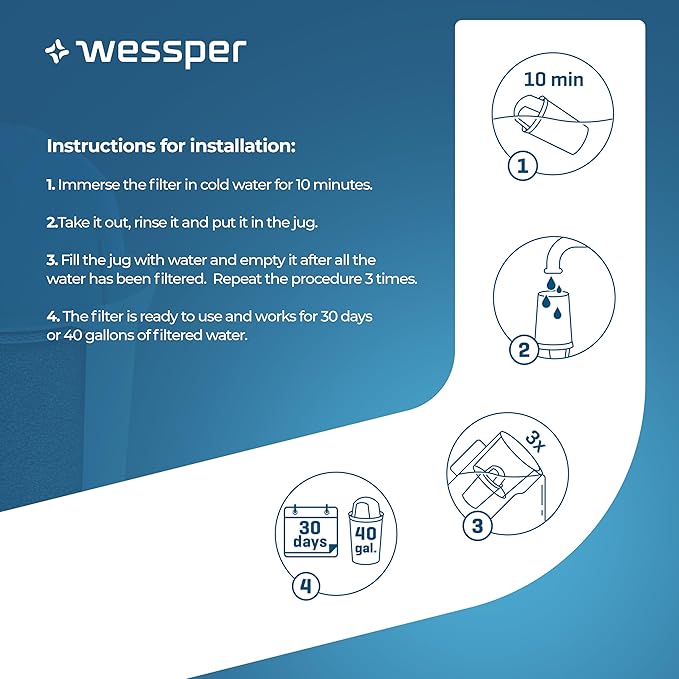 - PREMIUM QUALITY: Our products are manufactured in Europe using high quality, food grade materials which guarantee an efficient filtration performance, high flow rate and safety. All Wessper pitcher water filters are 100% BPA-Free providing you with a peace of mind about the safety of you and your loved ones. Each filter has a long lifespan of up to 40 gallons (Depending on your local water conditions) making it a great choice filter replacement