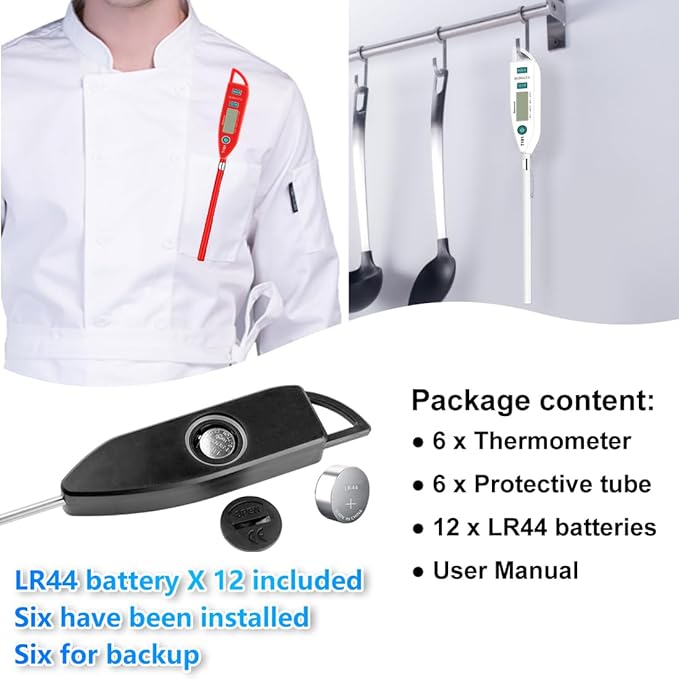 - [ Long Probe Probe protection tube with clip With Backup Battery ] The 5 inch long probe is made of food-safe 304 stainless steel. Package Contents: 6 x Thermometer(Black and Red and White); 6 x Probe protective tube with clip; 1x Instruction Manual (Warranty); 12 x (LR44) Batteries (Six of the batteries have been loaded into six thermometers each. The other six are for backup.)