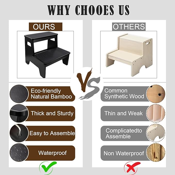 - Natural Bamboo Wood: This wooden step stool is made of natural bamboo, maintains a natural anti slip texture, with smooth edges and no burrs. Just use a soft cloth to wipe off the water and dirt on the stool