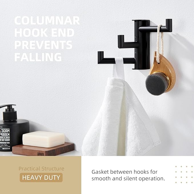 Angle Simple Swivel Towel Hook 3 Arms, SUS 304 Stainless Steel Foldable Bathroom Robe Towel Hook, Wall Coat Holder, Matte Black