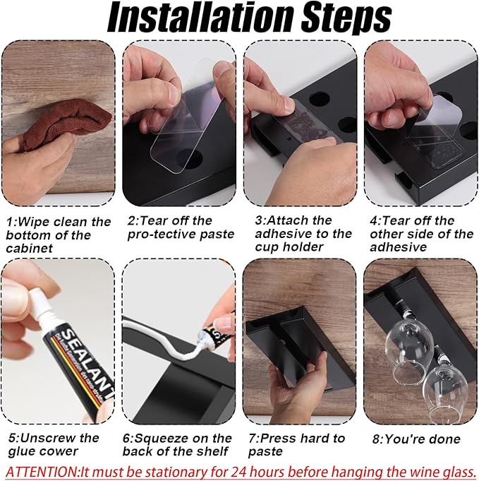 - 3. EASY TO INSTALL: The wine glass rack is equipped with self-adhesive adhesive, Punch-free,easy to install,Due to the different materials of cabinets, Suitable for different installation environments:bar glass holder,wine cabinet,kitchen cabinet,under shelf in receiption room etc.