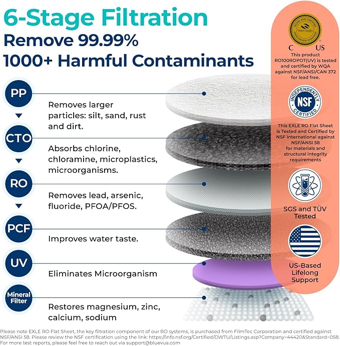 - 6-STAGE ADVANCED FILTRATION WITH UV LIGHT: The Bluevua RO100ROPOT-UV boasts a superior 6-stage filtration system, featuring a 0.0001μm RO membrane, including UV light and an added remineralization filter. Certified by WQA against NSF/ANSI/CAN 372 for lead-free and tested by SGS, this combination effectively reduces TDS, PFOA, PFOS, Chlorine, Fluoride, Arsenic, Lead, and more, while also enriching water with essential minerals, balancing taste and health benefits.