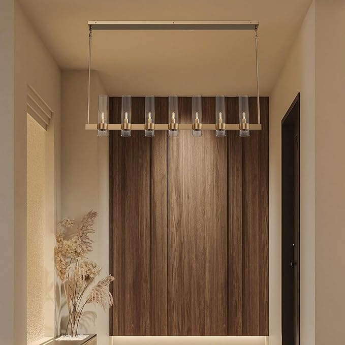 - [Stunning Modern Design] Our 7-light farmhouse linear chandelier is a sleek, linear pendant light fixture that adds an exquisite touch of style and sophistication to your kitchen island or dining room.