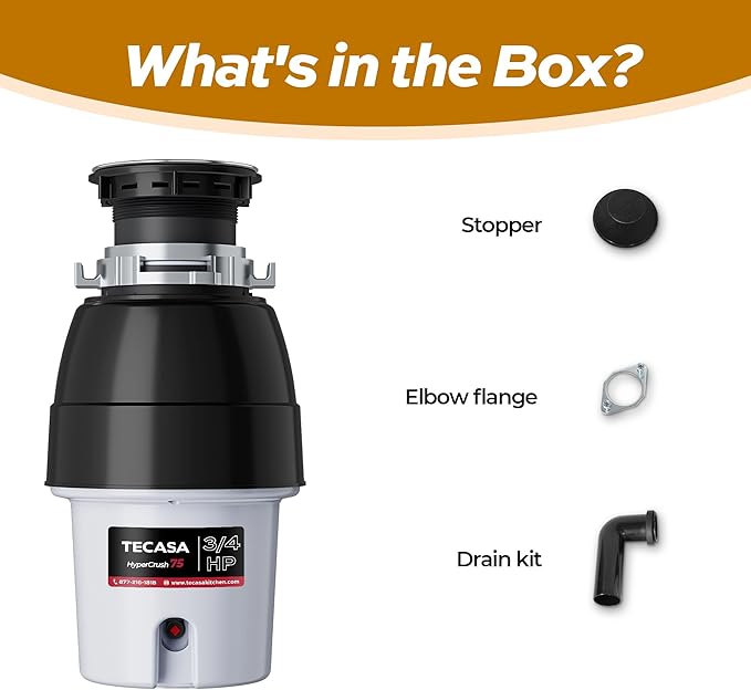 3/4 HP Corded Garbage Disposal for Kitchen Sinks, TECASA Continuous Feed Food Waste Disposer, Sound Reduction, Power Cord Included, Grey and Black - HyperCrush 75