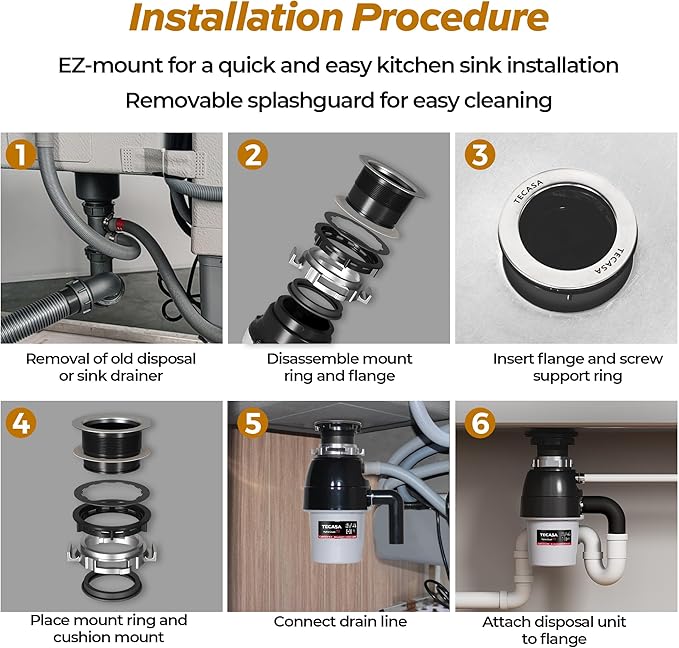 - ππππππ & ππππ πππππππ: TECASA garbage disposal is suitable for most home kitchens for standard 3-1/2 inch sink opening hole. A pre-installed 39" power cord for electricity connection.