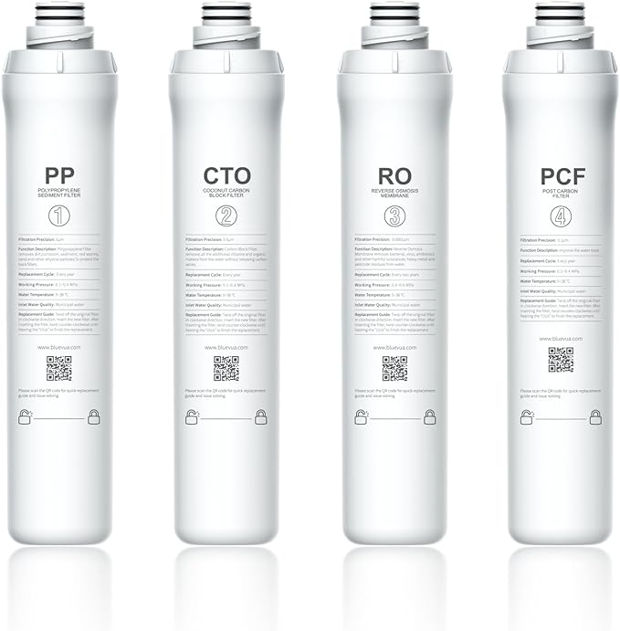 Bluevua RO100ROPOT 4-Pack Replacement Filter Set, Pack of 1 PP Filter and 1 CTO Filter and 1 RO Filter and 1 PCF Filter