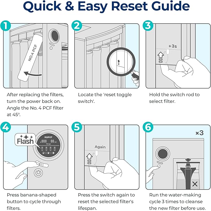 - EASY FILTER RESET AND SUPPORT: After replacing filters, don't forget to reset the filter lifespan. If you encounter any issues during the reset process, our reliable customer support is readily available to assist you, ensuring a seamless experience with your RO100ROPOT system.