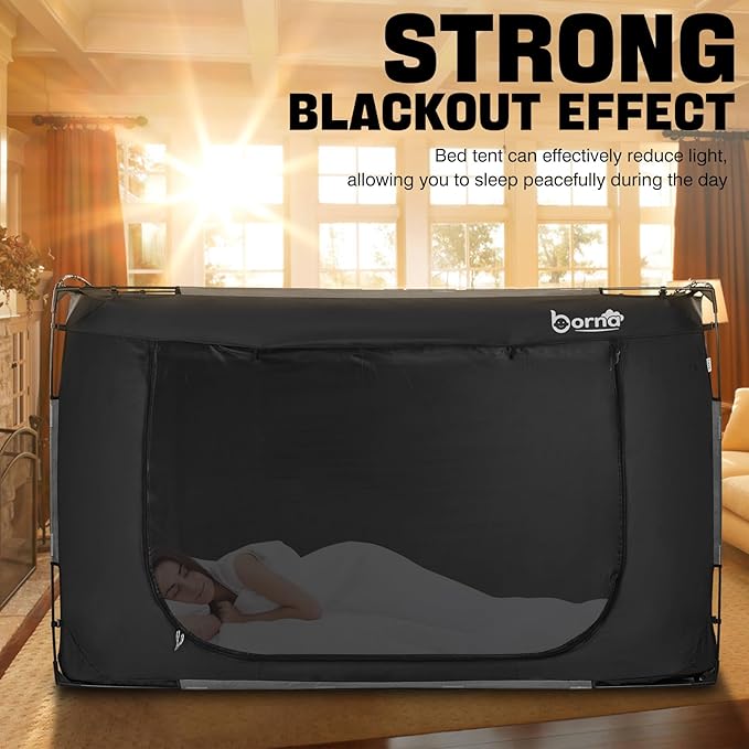 - RECTANGULAR PATENTED DESIGN: BORNA bed tent is designed with unique inserted poles, compared to pop-up tents on the market, we use 9.5mm fiber poles to create this through pole blackout tent, which won't collapse or bend, making it more stable and durable. The rectangular frame structure is also very spacious, making it an ideal choice for you.