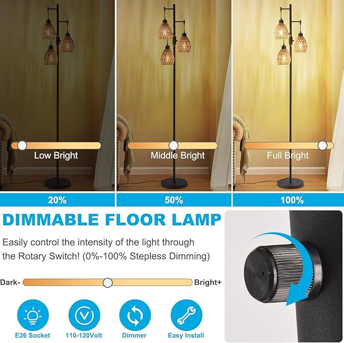 - Natural Rattan Shade & Reinforced Base - The bohemian floor lamp comes with 3 hand-woven wicker shades, eco-friendly, good light transmission and soft light. Reinforced base made of metal and non-slip materials, great stability guarantees your safety. Whether you install Lumenfox bright floor lamp in your house, you will enjoy the warmth of the light and the wonderful ambiance.
