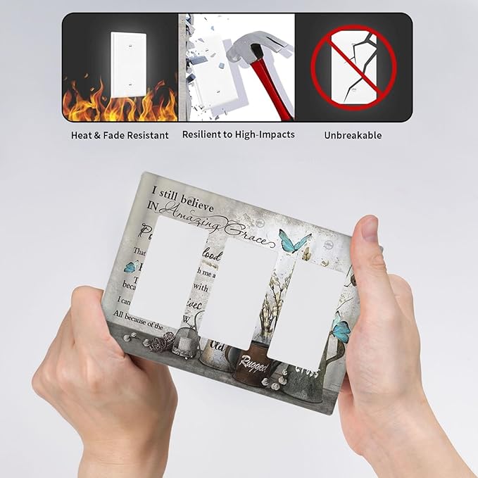 Blue Butterfly Rustic Flower Inspirational Quotes 3 Gang Rocker Light Switch Covers Triple Outlet Wall Plate Decorative Switchplate Cover Faceplate GFCI for Farmhouse Country Bedroom Kitchen Decor