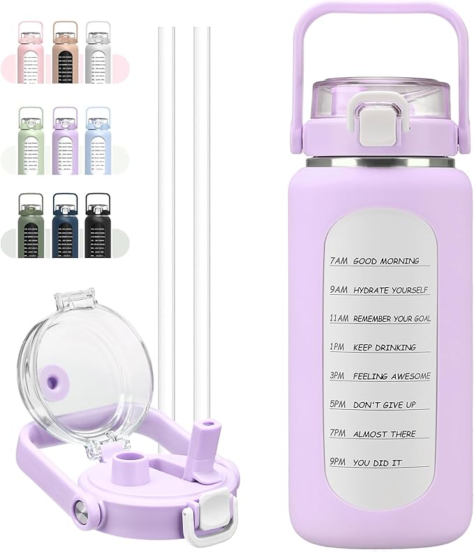 BLUEGO 64oz Insulated Water Bottle with Straw and Handle Leakproof Half Gallon Wide Mouth Motivational Water Bottle, 2-IN-1 Straw Spout Lid Stainless Steel Water Jug for Sport Travel Gym-Purple