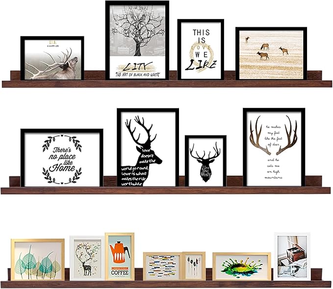 - [Ideal for Wall Decor]: The size of photo ledge is 48 in x 4.5 in x 1.8 in, a set of 3. This wall floating shelf makes greater use of your wall space and adds a decorative touch to your home. This wall floating shelf in deep walnut wood color is suitable for various styles of furniture decoration, simple and generous.