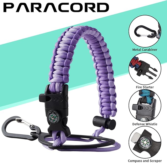 - UNIQUE PARACORD—Perfect Accessories: bright color paracord matches the flask water bottles to give you a youthful vibe while adding a personal style. It comes with a compass, safety loop, metal carabiner, flint, igniter, and whistle to become your survival tool for your wild adventures