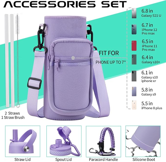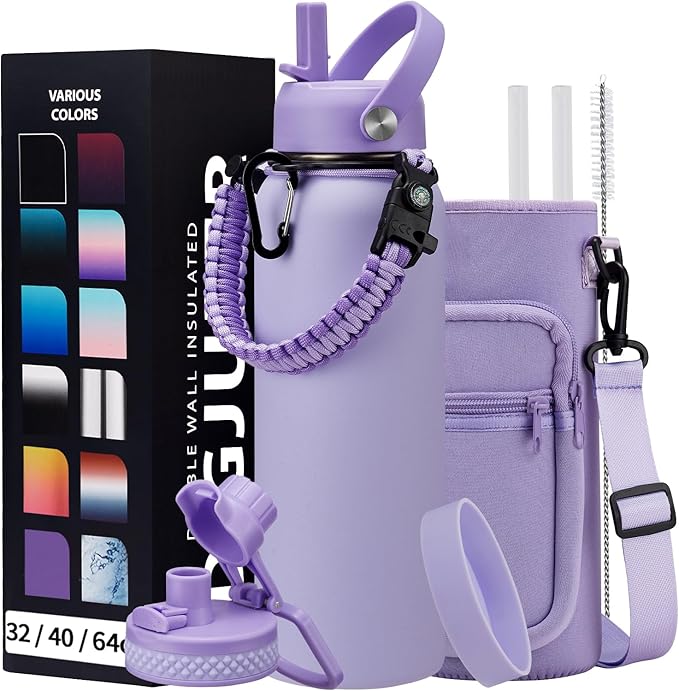 - COMBO—Super Deal: Buy 40 oz insulated water bottle and get 9 accessories (2 x lids, 1 x survival paracord, 1 x carrying pouch, 1 x shoulder strap, 1 x protective cup mat, 2 x straws, 1 x straw brush). WITH A LIFETIME GUARANTEE, these metal water bottles are the perfect gift for use at home, work, school, road trips, hiking, sporting events, or just hanging out